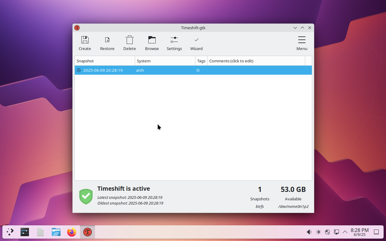 sudo timeshift --list First run mode (config file not found) Selected default snapshot type: BTRFS Mounted '/dev/nvme0n1p3' at '/run/timeshift/1306/backup' btrfs: Quotas are not enabled Selected default snapshot device: /dev/nvme0n1p3 Device : /dev/nvme0n1p3 UUID : f9c7549c-214d-4667-a9d2-d76677627558 Path : /run/timeshift/1306/backup Mode : BTRFS Status : OK 1 snapshots, 49.8 GB free Num Name Tags Description ------------------------------------------------------------------------------ 0 > 2025-06-09_12-59-40 D after update