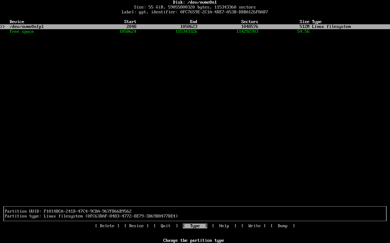 fdisk -l /dev/nvme0n1 Disk /dev/nvme0n1: 55 GiB, 59055800320 bytes, 115343360 sectors Disk model: VMware Virtual NVMe Disk Units: sectors of 1 * 512 = 512 bytes Sector size (logical/physical): 512 bytes / 512 bytes I/O size (minimum/optimal): 512 bytes / 512 bytes Disklabel type: gpt Disk identifier: 0FC7659E-2C1A-4DE7-A53B-DDBA126F8AD7 Device Start End Sectors Size Type /dev/nvme0n1p1 2048 1050623 1048576 512M EFI System /dev/nvme0n1p2 1050624 13633535 12582912 6G Linux swap /dev/nvme0n1p3 13633536 115341311 101707776 48.5G Linux filesystem lsblk NAME MAJ:MIN RM SIZE RO TYPE MOUNTPOINTS loop0 7:0 0 846.7M 1 loop /run/archiso/airootfs sr0 11:0 1 1.2G 0 rom /run/archiso/bootmnt nvme0n1 259:0 0 55G 0 disk ├─nvme0n1p1 259:1 0 512M 0 part ├─nvme0n1p2 259:2 0 6G 0 part └─nvme0n1p3 259:3 0 48.5G 0 part