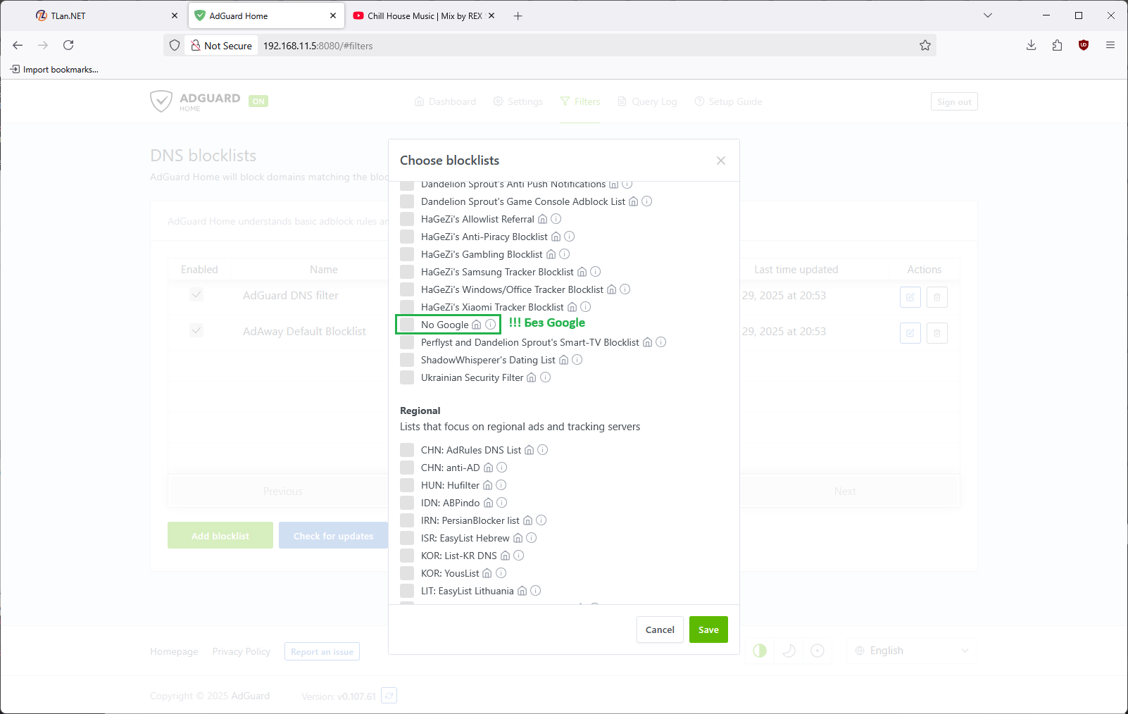 Може да избирате всичко останало без No Google. В противен случай няма да можете да ползвате Google търсачката. Лично аз тествах всички блокировки бе Google и си работеше перфектно.