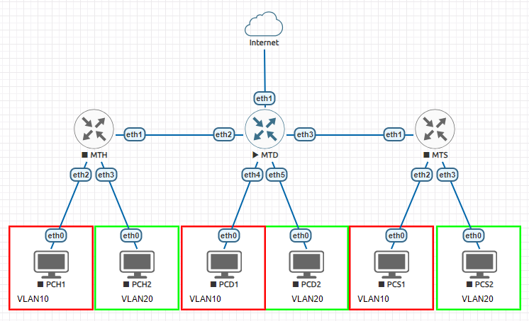 Имаме 3 рутера. MTD ще играе ролята на рутер, а MTН и MTS ще играят ролята на суич. Няма да задълбаваме в цялата схема, а ще наблегнем на изграждането на VLAN-ове. PCH1, PCD1 и PCS1 са 3 компютъра принадлежащи на VLAN10 PCH2, PCD2 и PCS2 са 3 компютъра принадлежащи на VLAN20 Ще започнем с рутер MTD. - ether2, ether3 са тагнати портове. През тях трябва да се маркират пакетите от VLAN-овете. - ether4 и ether5 са унтагнати портове.