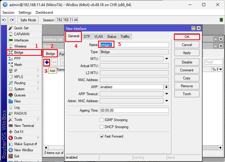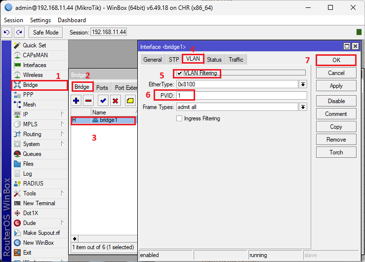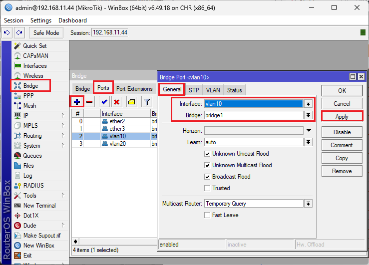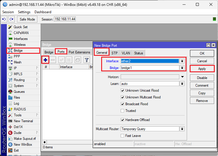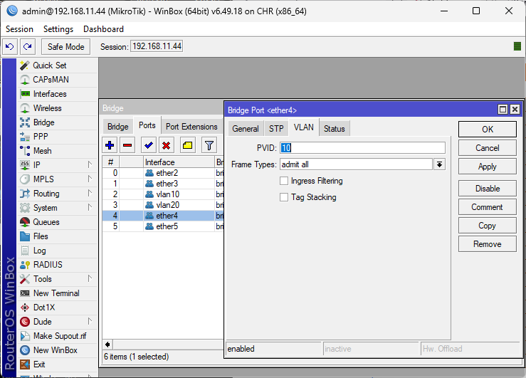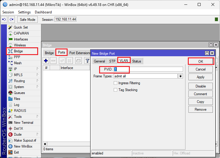 Сега трябва да добавяме интерфейси към бриджа. За начало ще добавим интерфейсите ether2 и ether3. Забележете, те ще са във VLAN PVID:1. Това ще са тегирани портове (интерфейси).