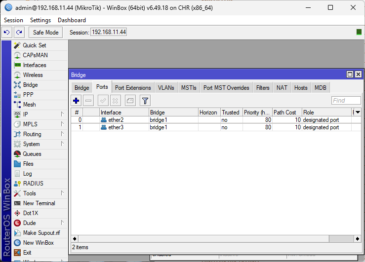 /interface bridge port add bridge=bridge1 interface=ether2 pvid=1 /interface bridge port add bridge=bridge1 interface=ether3 pvid=1