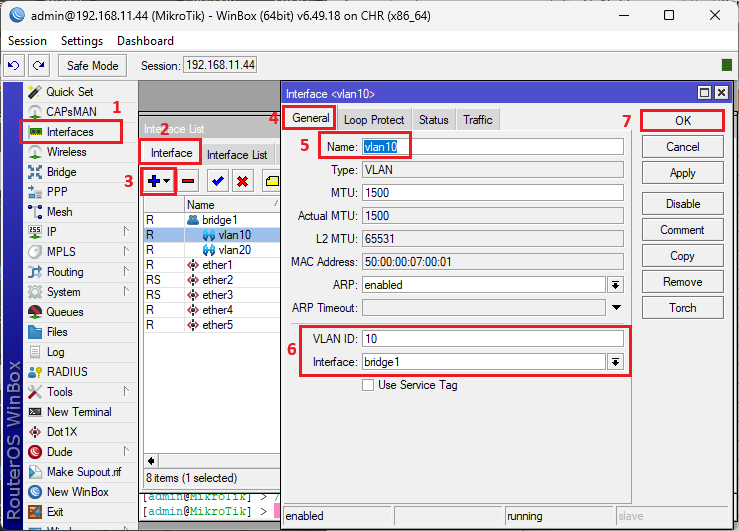 До тук имаме изграден бридж и към него добавени два интерфейса (порта). През тези портове трябва да минава маркиран (тегиран) трафик. Същия маркиран трафик ще премине и през бриджа bridge1. За да може да разпределяме трафика към VLAN10 и VLAN20 към бриджа трябва да създадем два виртуални интерфейса. В случая ще са VLAN10 и VLAN20