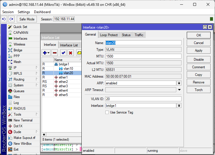 Забележете, двата VLAN-a са съответно с ID 10 и 20. Това указва, че ще се маркира TCP пакета за VLAN10 и VLAN20. Вече имаме всички интерфейси които са ни необходими. Ако погледнем схемата която имаме ще видим, че маркиран (тагнат) трафик трябва да има на портове ether2, ether3, bridge1. Унтагнати портове трябва да са ether4 и ether5. На тези два порта TCP пакета вече няма да е маркиран.
