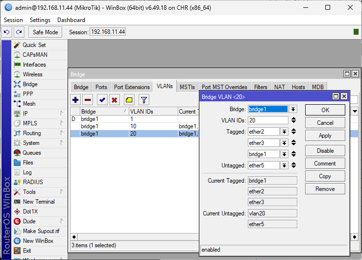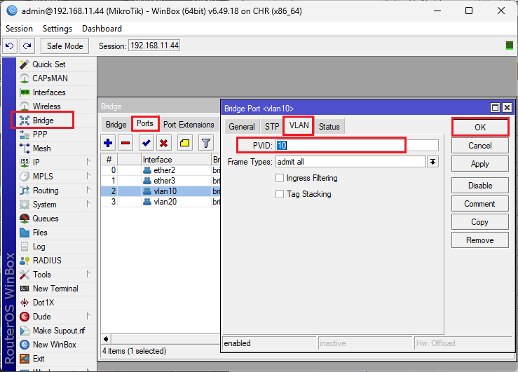 /interface bridge port add bridge=bridge1 interface=vlan10 pvid=10 /interface bridge port add bridge=bridge1 interface=vlan20 pvid=20