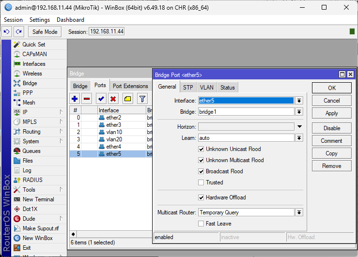Сега да трябва да укажем кои портове ще са тагнати и кои не в съответните VLAN-ове. Да проверим в bridge1 какви динамични VLAN-ове се дефинираха.