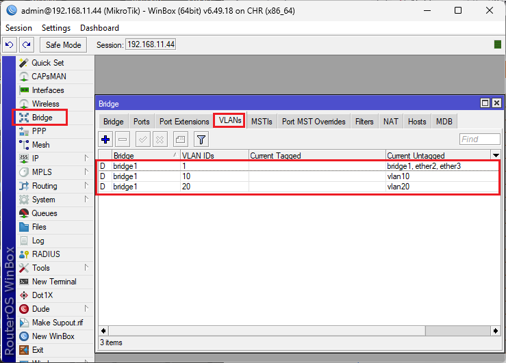 /interface bridge add name=bridge1 vlan-filtering=yes /interface vlan add interface=bridge1 name=vlan10 vlan-id=10 add interface=bridge1 name=vlan20 vlan-id=20 /interface bridge port add bridge=bridge1 interface=ether1 add bridge=bridge1 interface=vlan10 pvid=10 add bridge=bridge1 interface=ether2 pvid=10 add bridge=bridge1 interface=vlan20 pvid=20 add bridge=bridge1 interface=ether3 pvid=20 /interface bridge vlan add bridge=bridge1 tagged=ether1,bridge1 untagged=ether2 vlan-ids=10 add bridge=bridge1 tagged=ether1,bridge1 untagged=ether3 vlan-ids=20