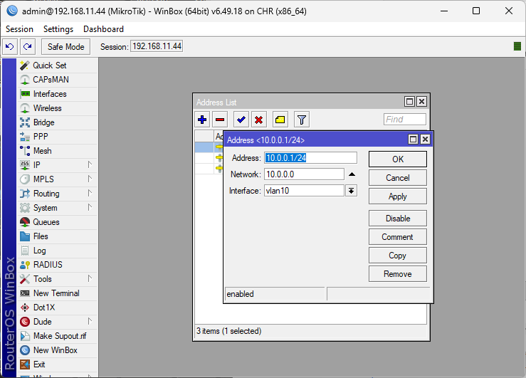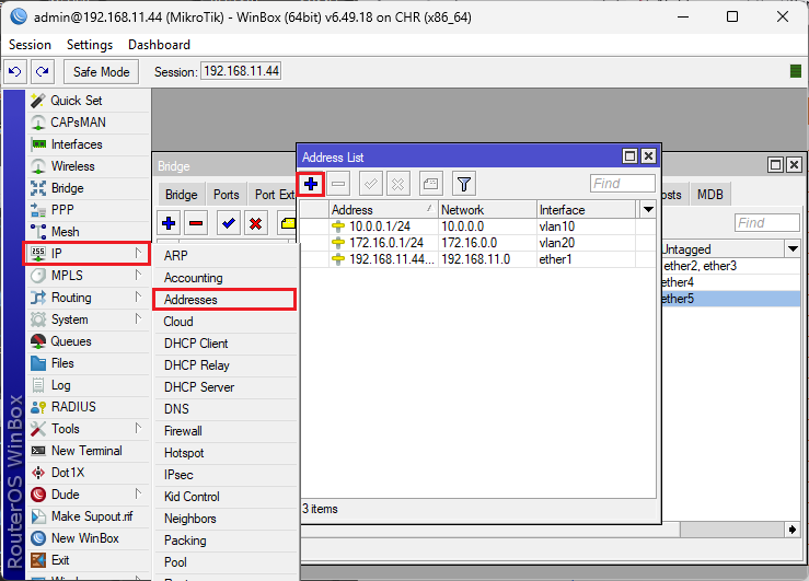 /ip address add address=10.0.0.1/24 interface=vlan10 network=10.0.0.0 /ip address add address=172.16.0.1/24 interface=vlan20 network=172.16.0.0