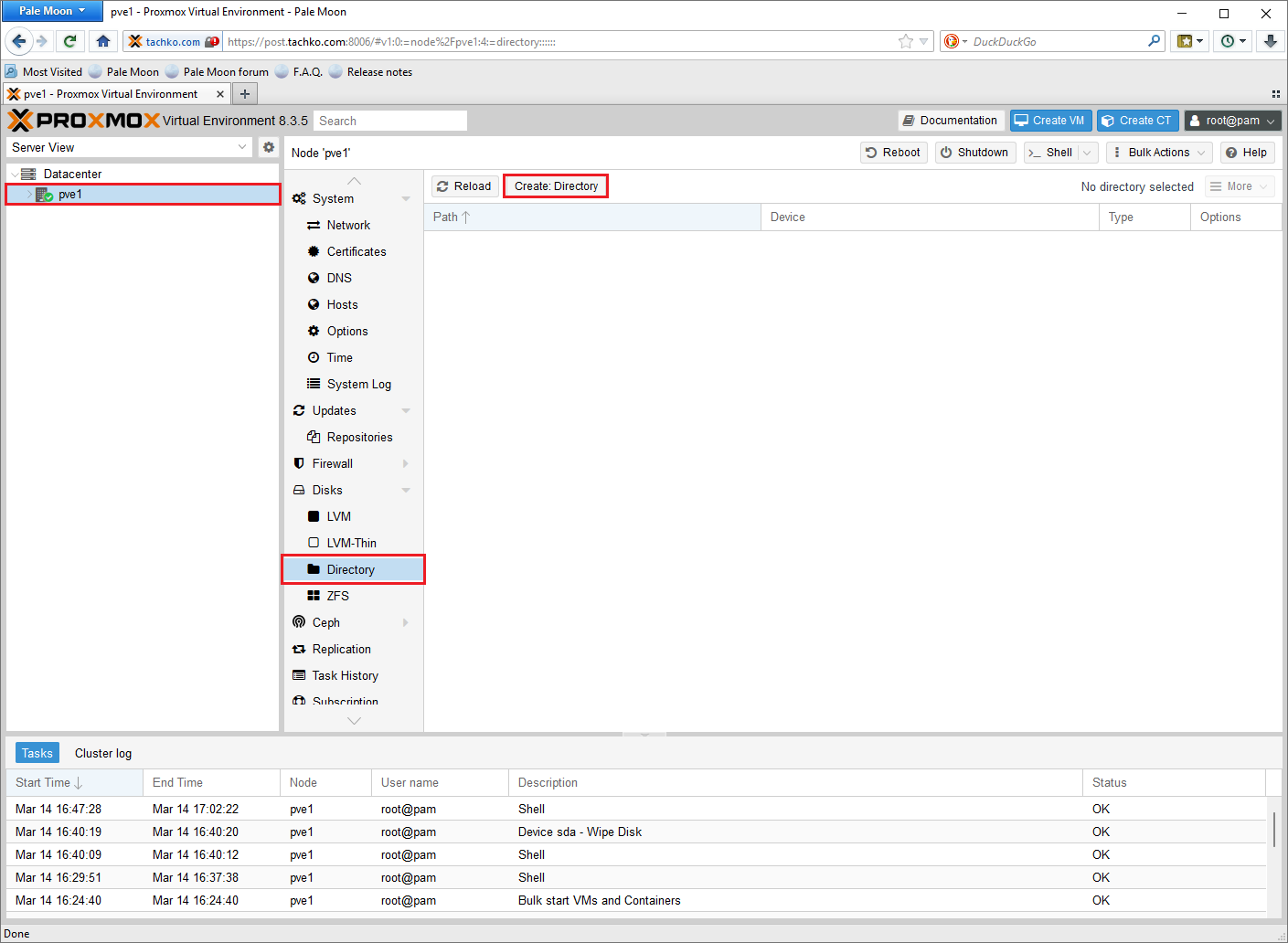 Появи се новия диск като монтирана директория в /mnt/pve/SATA_1TB. Тук трябва да отбележа, че ползвах дефиниране на диска като Disrectory за да може на по-късен етап да го укажем в Storage като Disk image, VZDump backup file ... и т.н.