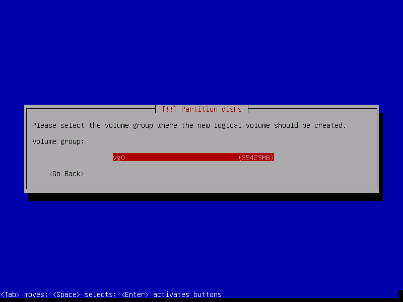 Завършваме с дефиниране на тома. Простичка инсталация, всичко в един том. Забележете не сме дефинирали swap. На първо време той не е нужен.