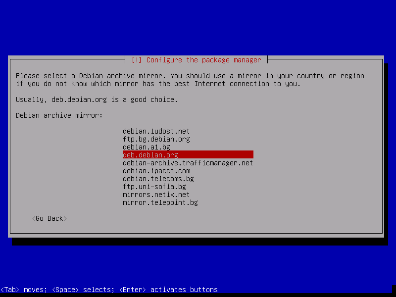 Предлага да дефинираме огледален сървър с архив на Debian пакети. Избираме огледалния сървър да се намира в България.