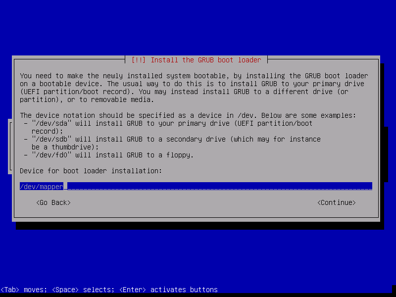 Поради бъга който споменах, вижте къде иска да запише GRUB, /dev/mappe, а ние казахме да е в /dev/sdb. Продължаваме