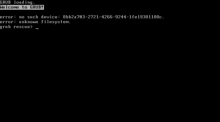 Една от грешките при развален GRUB. Можете да видите три грешки - grub> - Най-лекия проблем. GRUB открива всичко (ядро, модули), без конфигурационния файл grub.cfg - grub rescue> - Малко по-сложен проблем. GRUB е зареден в MBR но не може да открие папката /boot/grub - GRUB: - Най-лошия вариант. GRUB не е успял да открие дори основната информация за работа. При този проблем задължително трябва да се заредите през LiveCD и да ремонтирате системата. Не показвам най-лесния вариант, защото той е част от този. И така, имаме грешка grub rescue>. Поне част от GRUB e зареден. Да проверим: