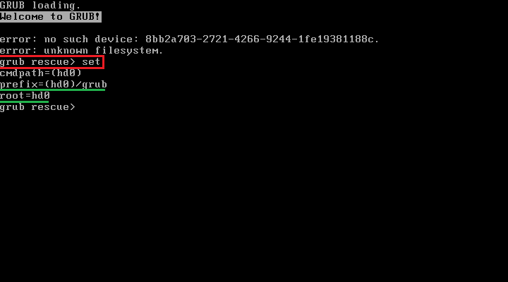 set prefix=(hd0,gpt2)/boot - казваме, че тук ще се намира конфигурацията на GRUB. set root=(hd0,gpt2) - тук ще се намират ядра модули и т.н. Това на практика е /boot. Накрая с комндата set проверяваме какви нови настройки дефинирахме чрез предните команди за root и prefix. Отново да проверим дали правилно зададохме новите конфигурации: