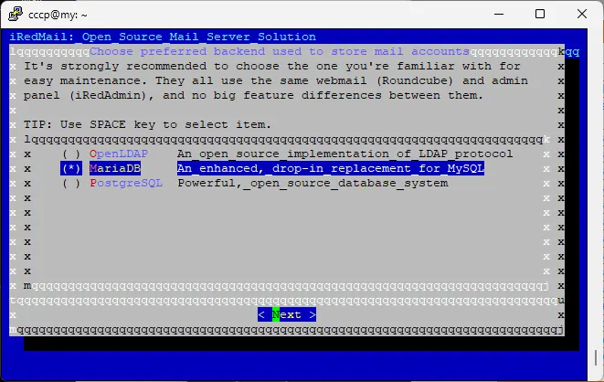 Storage base directory: /var/vmail * Mailboxes: * Daily backup of SQL/LDAP databases: * Store mail accounts in: MariaDB * Web server: Nginx * First mail domain name: my.tlan.net * Mail domain admin: postmaster@my.tlan.net * Additional components: Roundcubemail netdata iRedAdmin Fail2ban < Question > Continue? [y|N] y