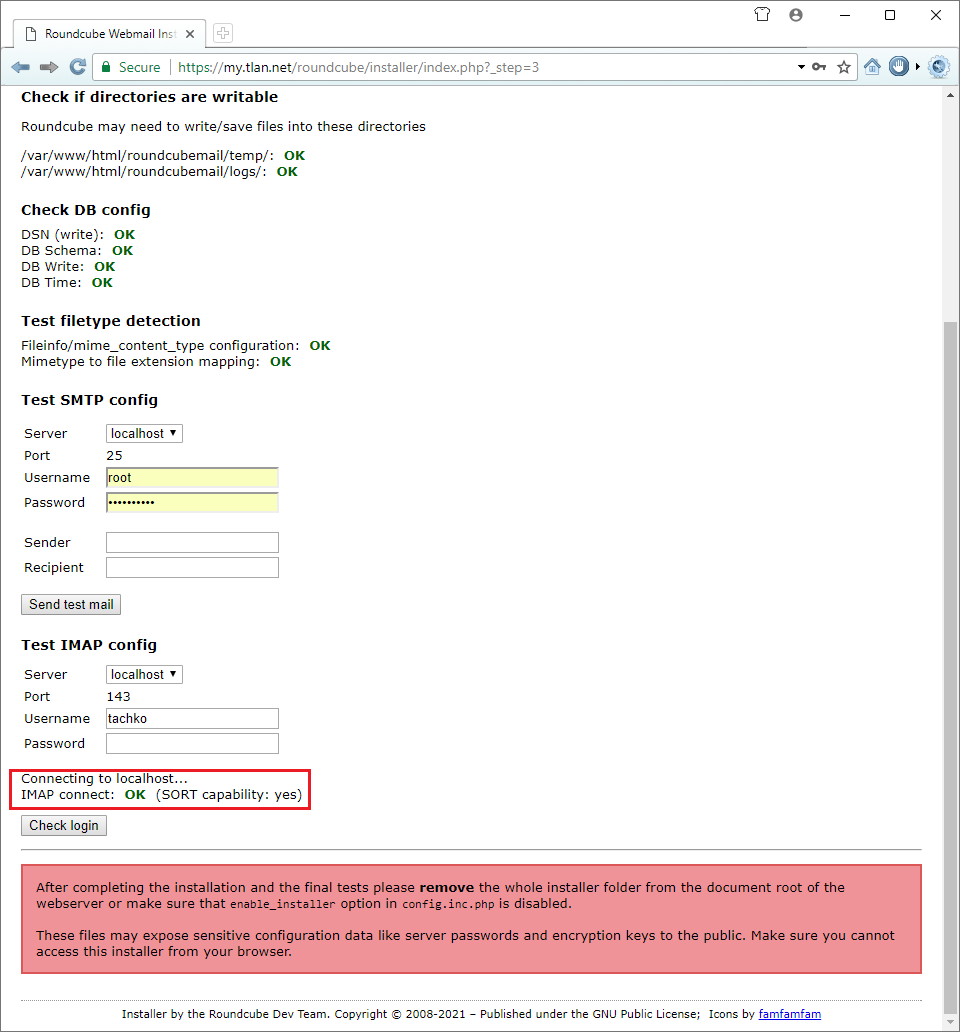 Най-отдолу ни предупреждава след завършване на инсталацията да изтрием installer папката или да се убедим че enable_installer опцията във файла config.inc.php е със значение disabled. Същевременно с това имаме и опцията да тестваме. Имаме два потребителя root и cccp, още по време на инсталацията. Да създадем още един с права подобни на cccp.
