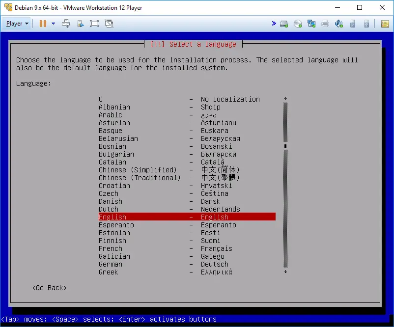 Предлага ни да изберем езика на който ще инсталираме. Тествал съм с език на инсталация Bulgarian, но за съжаление има бъгове, затова избираме English и натискаме Enter за продължение.