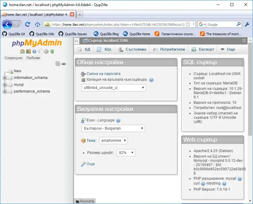 И сега ако напишем в браузъра https://home.tlan.net/phpmyadmin/ ще се отвори страницата за управление на базите данни с PHPMyAdmin За да върнем старото състояние: