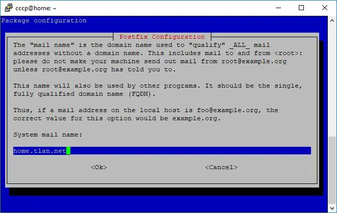 Независимо, че избрахме mail name да е home.tlan.net, това не е от значение, защото тука хост името и домейн името няма да се присъединяват към пощенския домейн. Пощенския домейн и адресите ще се дефинират в MySQL базата. Горе казаното не е точно така. За пояснение: - домейна ни е home.tlan.net. - хоста също се казва по пълно име (FQDN) home.tlan.net. И тъй като си съпадат това е проблем. Реално би трябвало FQDN да е home.home.tlan.net. Нарочно сега ще оставим нещата така. На по-късен етап когато проверяваме правилността на работа на PostFix ще изясним нещата.