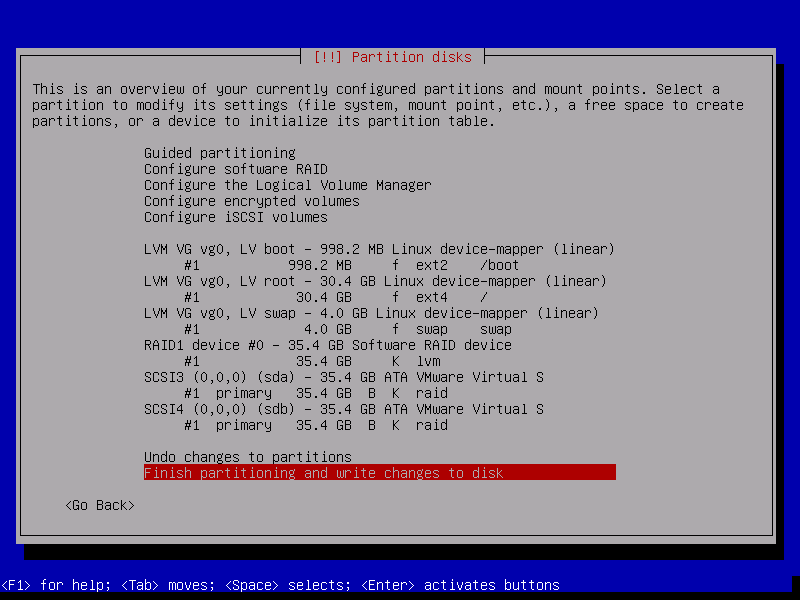 lsblk sda 8:0 0 33G 0 disk └─sda1 8:1 0 33G 0 part └─md0 9:0 0 33G 0 raid1 ├─vg0-boot 253:0 0 952M 0 lvm /boot ├─vg0-swap 253:1 0 3.7G 0 lvm [SWAP] └─vg0-root 253:2 0 28.3G 0 lvm / sdb 8:16 0 33G 0 disk └─sdb1 8:17 0 33G 0 part └─md0 9:0 0 33G 0 raid1 ├─vg0-boot 253:0 0 952M 0 lvm /boot ├─vg0-swap 253:1 0 3.7G 0 lvm [SWAP] └─vg0-root 253:2 0 28.3G 0 lvm / sr0 11:0 1 1024M 0 rom