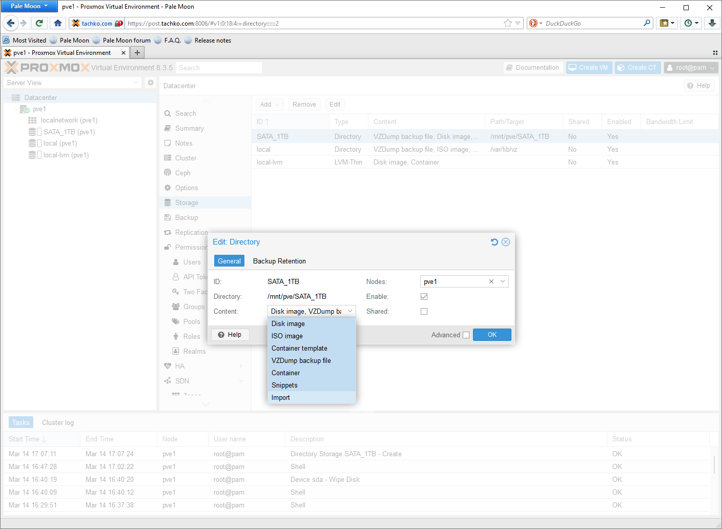 Появи се новия диск като монтирана директория в /mnt/pve/SATA_1TB. Тук трябва да отбележа, че ползвах дефиниране на диска като Disrectory за да може на по-късен етап да го укажем в Storage като Disk image, VZDump backup file ... и т.н.