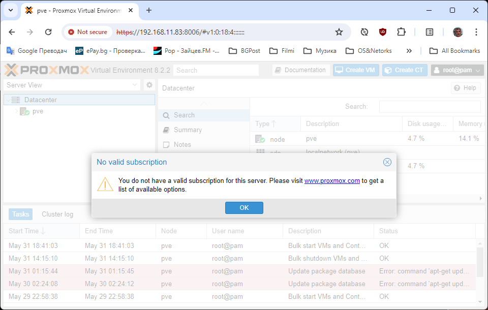 Инсталирахме ProxMox ТУК, време е да го оптимизираме. Ако се сещате по време на инсталацията създадохме един RAID масив и останаха свободни още 2 диска, които също трябва да ги включим чрез RAID масив. Но все пак първата стъпка е да си актуализираме репозиторите и програмата.
