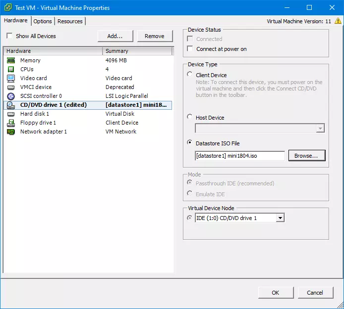 За целта е необходимо да има изтеглено ISO на операционната система. Да има създадена празна виртуална машина. Да има клиентски софтуер за връзка със виртуалната машина (ВМ). В случая имаме mini1804.iso (Ubuntu 18.04 Net Install), Test VM (тестова празна ВМ), разбира се и клиентския софтуер. За начало да запишем ISO файла на сървъра.