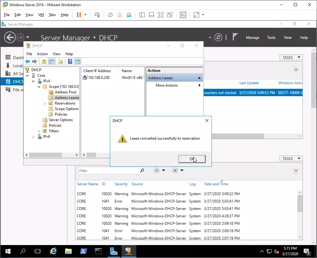 Виждаме, че на клиента е раздал IP адрес 192.168.0.200. Това е адрес от указания пул.