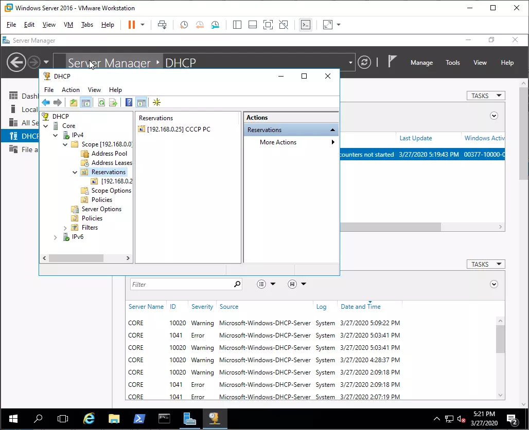 Между другото ролята DHCP се появи и в лявата част на прозореца. От там може да се види на кой сървър управляваме ролята.