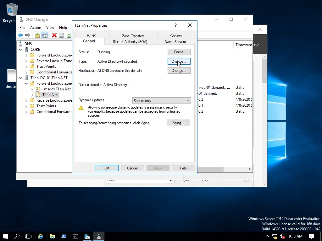 Вижте типа на зоната я дава Active Directory-Integrated. Съответно ако натиснем бутона Change… може да я променим на Primary, Secondary и Stub.