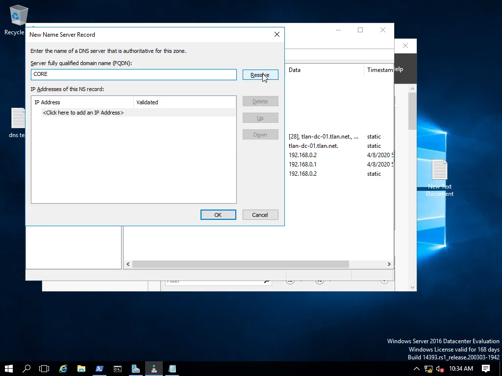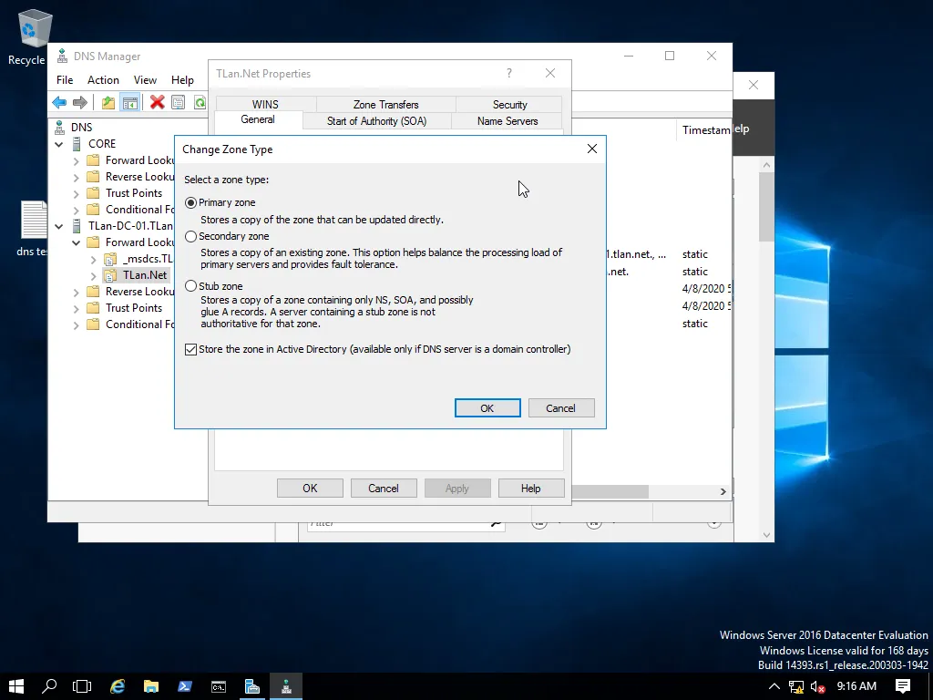 Така от тук може да се управляват двата DNS сървъра. В случая това е възможно, защото сме в Core.TLan.NET с администраторски акаунт на активната директория. Извода е, че може да се дефинират потребители които имат право да управляват както локалния DNS сървър, така и на активната директория. Сега е момента да направим разликата между двата вида DNS сървъри. Стандартно правим следната конфигурация за по-висока надеждност на DNS-ите. Имаме първичен DNS сървър (primary) и вторичен (secondary). Първичния може да чете и да записва, а вторичния само чете от първичния и репликира. Каквото се промени в първичния , вторичния го приема. Обратния случай не може. При DNS сървърите от активната директория не е така. Имаме примерно три DNS сървъра. Направим ли промяна на който и да е, то другите два ще я възприемат. Разликата между предния случай и тука, е че на практика всички DNS сървъри в активната директория са първични. Да продължим с тестовете. Дайте да администрираме домейна TLan.Net.