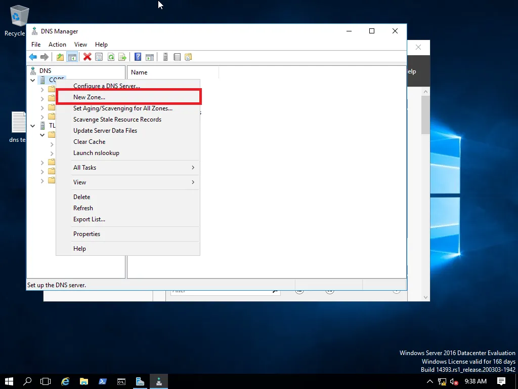Тука се указва как да се прави запис в активната директория. - None. Това забранява създаване на автоматични записи в DNS-a. Всичко се пише на ръка. - Nonsecure and secure. Крайно опасен. Така всеки може да прави записи в DNS сървъра на домейна без удостоверяване. - Secure only. Компютъра когато иска да регистрира записа трябва да се представи пред домейна. По-точно потребителя трябва да се е представил с име и парола. Така примерно някой компютър става член на домейна и автоматично му се добавя DNS запис за него, като преди това той се е представили в домейна с име и парола. На практика почти винаги се използва тази опция. Сега да поговорим за делегиране на зоните. Това е предаване на част от пълномощията за управление на част от зоната на друг субект. На практика се предават част от пълномощията на DNS сървъра на друг DNS сървър. Знаем DNS-a има дървовидна структура. С делегирането указваме висшестоящия домейн да указва къде се намира долно стоящият и с какви права. Да направим един тест. Създаваме домейн в домейна CORE.