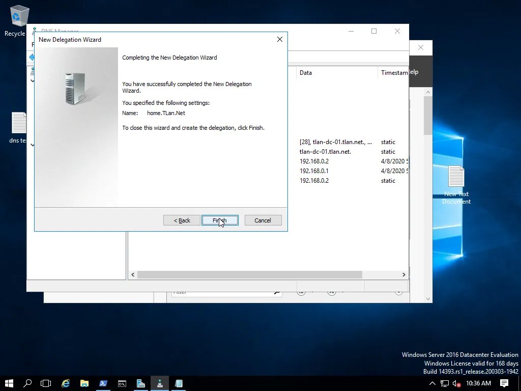 В DNS-a от активната директория, избираме зоната на TLan.Net, с десен бутон на мишката се отваря ново меню. От там избираме New Delegation….