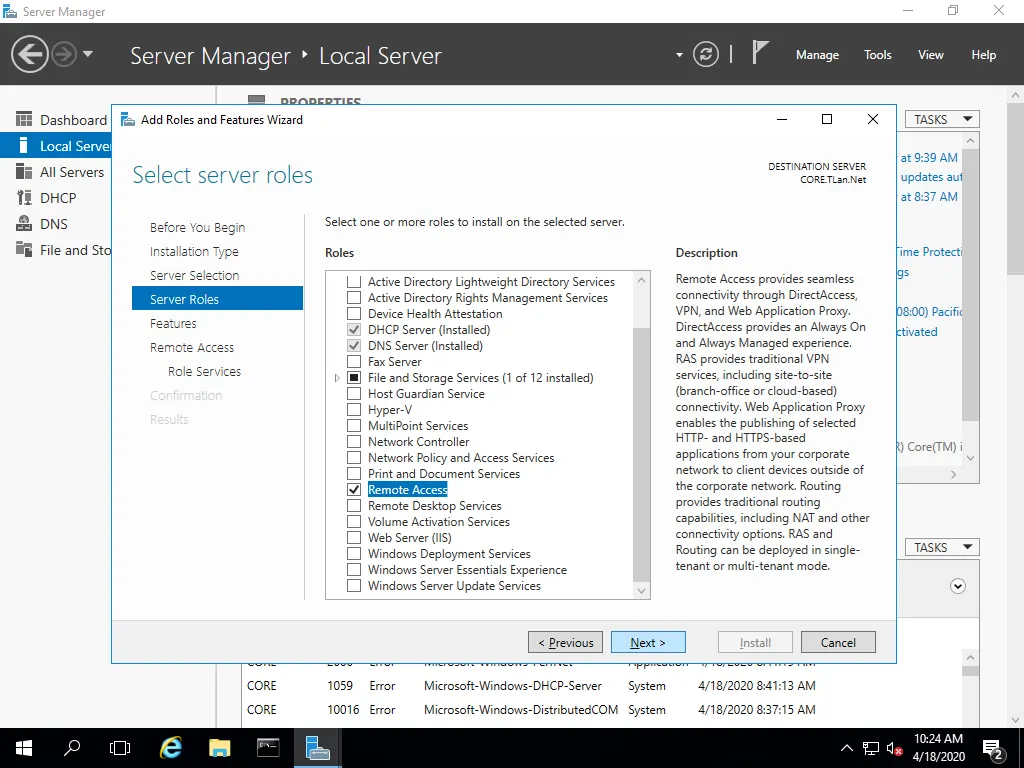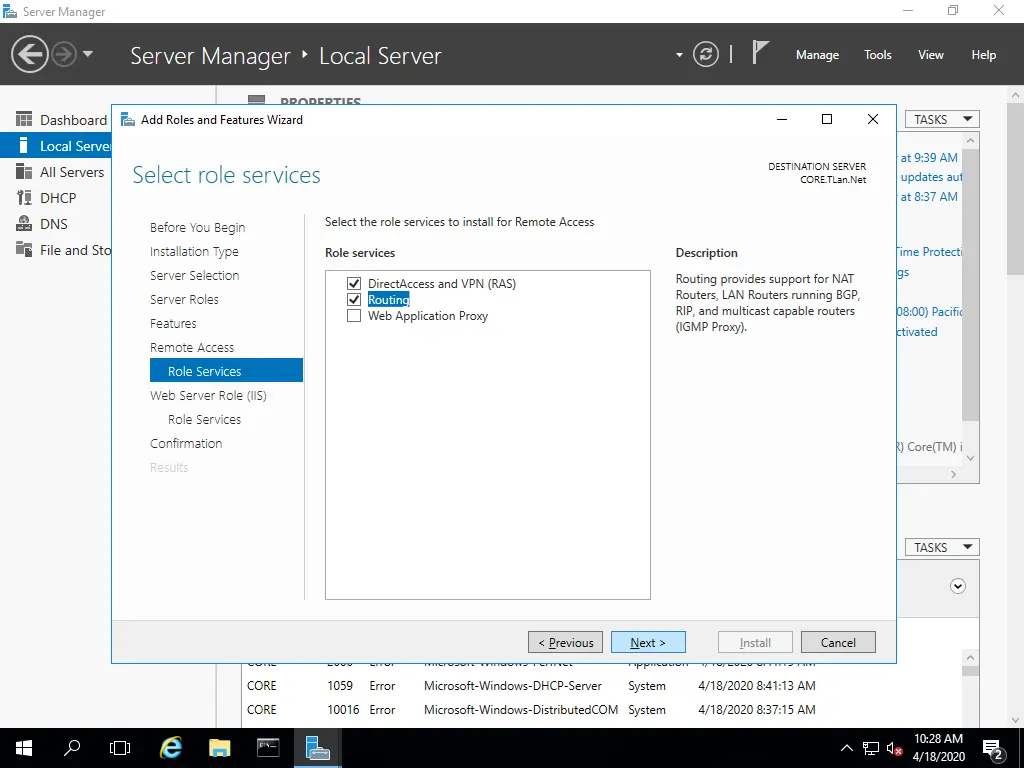 Предлага да изберем какви компоненти да има ролята. - DirectAccess and VPN (RAS): За да може да се изграждат VPN връзки. - Routing: Да може да рутира вътрешните мрежи, в случая 192.168.0.0/24 и 192.168.10.0/24 - Web Application Proxy: Този компонент прави минимални филтрации когато през Интернет се обръщат към WEB сървъра ни. Избираме Routing, това автоматично прави избор и на DirectAccess.