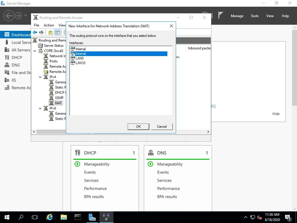 - Рутера ще рутира не само вътрешната мрежа (LAN and demand-dial routing), - IPv6 няма да ползваме, - IPv4 Remote access server: Включен. Означава, че ще може да рутира и VPN клиентите. Да се прехвърлим на компютъра TLan-DC-01. Отваряме Command Prompt. C:\Windows\system32>ipconfig Windows IP Configuration Ethernet adapter Ethernet0: Connection-specific DNS Suffix . : IPv4 Address. . . . . . . . . . . : 192.168.0.2 Subnet Mask . . . . . . . . . . . : 255.255.255.0 Default Gateway . . . . . . . . . : 192.168.0.1 Да се пробваме да достъпим TLan-DC-02. C:\Windows\system32>ping TLan-DC-02 Pinging TLan-DC-02.TLan.Net [192.168.10.2] with 32 bytes of data: Reply from 192.168.10.2: bytes=32 time< 1ms TTL=127 Reply from 192.168.10.2: bytes=32 time=1ms TTL=127 Reply from 192.168.10.2: bytes=32 time=2ms TTL=127 Reply from 192.168.10.2: bytes=32 time=1ms TTL=127 Ping statistics for 192.168.10.2: Packets: Sent = 4, Received = 4, Lost = 0 (0% loss), Approximate round trip times in milli-seconds: Minimum = 0ms, Maximum = 2ms, Average = 1ms Всичко работи. Да се уверим, че работи като се рутира през CORE. C:\Windows\system32>tracert -d TLan-DC-02 Tracing route to TLan-DC-02.TLan.Net [192.168.10.2] over a maximum of 30 hops: 1 < 1 ms * <1 ms 192.168.0.1 2 1 ms 1 ms 1 ms 192.168.10.2 Виждаме, че първата стъпка е през рутера CORE и след това се обръща към TLan-DC-02. По този начин създадохме рутиране между мрежите които имаме. Сега да направим така, че клиентите от вътрешната мрежа да могат да излизат в Интернет. Първо да се убедим, че за сега нямат. C:\Windows\system32>ping 8.8.8.8 Pinging 8.8.8.8 with 32 bytes of data: Request timed out. Request timed out. Request timed out. Request timed out. Ping statistics for 8.8.8.8: Packets: Sent = 4, Received = 0, Lost = 4 (100% loss), За сега нямат достъп. Връщаме се на компютъра CORE.
