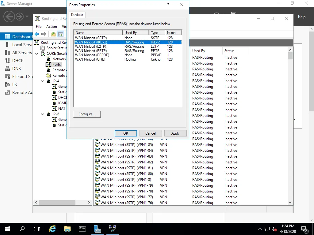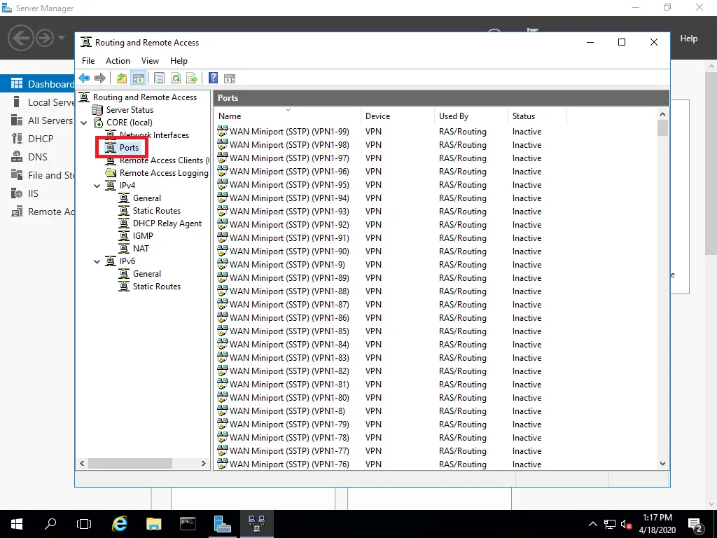 Поглеждайки портовете, виждаме 16 възможни връзки през PPTP, които в момента са неактивни, поради факта, че яма вързан клиент през PPTP протокола. Сега да определим как клиента да се удостоверява в домейна през VPN-a. Има два пътя. Удостоверението го дава RRAS сървъра. Пример: Клиента се връзва към RASS сървъра през VPN с име и парола. Името и паролата се проверяват в активната директория. Ако ги има RASS сървъра позволява на клиента да се върже към активната директория. Значи пътя е следния. Клиента с име и парола запитва RASS сървъра. RASS сървъра се обръща към домейн контролера да провери дали са верни. Домейн контролера отговаря за истинността на името и паролата. В зависимост от истинността RASS сървъра или позволява или забранява достъпа на клиента до активната директория. Втори начин. Ползването на RADIUS сървър. Разликата от горния начин е, че между RASS сървъра и домейн контролера стои RADIUS сървъра. Тогава пътя е следния: Клиент > RASS сървър > RADIUS сървър > DC > RADIUS сървър > RASS сървър > Отговор на клиента. Имайки в предвид горе казаното да изградим една VPN връзка.